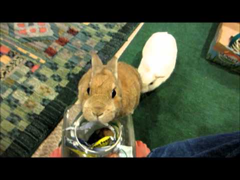 The sound of my opening the treat jar is a call to arms for any bunnies within earshot. Bunya is so excited, he's trying to jump in and get his own. Lucy hangs back - she wants hers, but plays it safe just in case it's a trap to pick her up (mmmm ... could be ....). She is so nervous about that possibility that she drops the treat and then ducks in low to grab it.